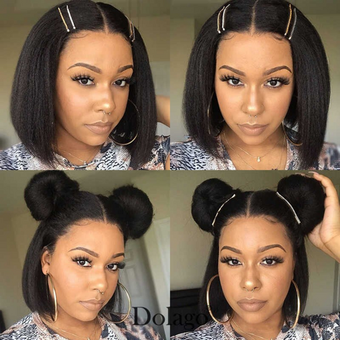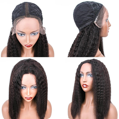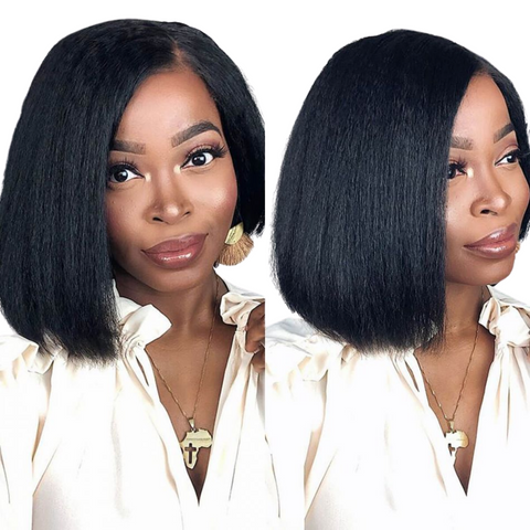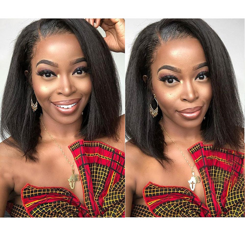 Kinky Straight Bob Human Hair Wigs 150 Density Coarse Yaki Brazilian Short Bob T Part Lace Front Wig